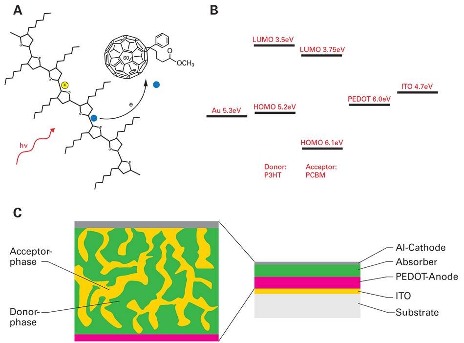 Figure 4. (a) A common donor/acceptor pair used in organic solar cells: poly- 3(hexylthiophene) (P3HT) as the donor (p-type) and [6,6]-phenyl C61 - butyric acid methyl ester (PCBM, a C60-derivative) as the acceptor (n-type). (b) HOMO and LUMO levels of P3HT and PCBM in comparison with the work functions of Au, PEDOT and ITO. (c) The stacking of an organic bulk heterojunction solar cell.