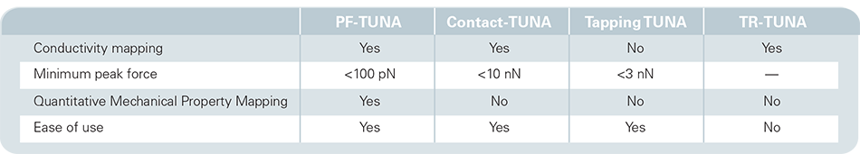 PeakForce TUNA (PF-TUNA) builds on PeakForce Tapping, and in doing so, also acquires the capability of PeakForce quantitative nanomechanical measurements (PeakForce QNM).