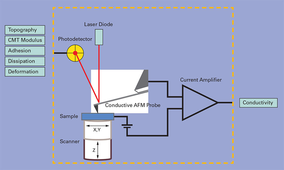 Figure 1. Illustration of PeakForce TUNA setup for simultaneous topography, mechanical and electrical property mapping.