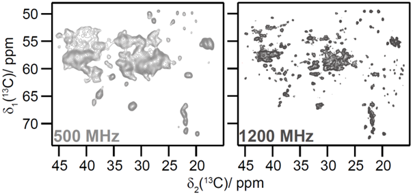 Figure 1: 20 ms DARR spectra of the DnaB helicase from Helicobacter pylori, recorded at 500 MHz and at 1.2 GHz.