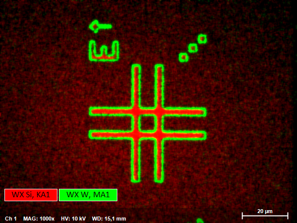 In order to achieve a high spatial resolution on the micro- and nano level during quality control, the analyses have to be carried out at low accelerating voltages, complicating the identification of these phases. Only the tungsten M series energy lines which severely overlap with the substrate Si Kα line are generated at low accelerating voltages.