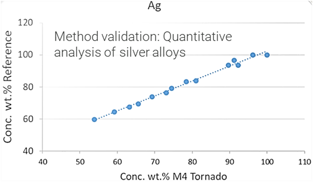 Fig. 8: Linear correlation between the measured and certified concentration of Ag in wt%, the deviation can be used for fine-tuning the FP-based calibration of the M4 TORNADO within the M4 software.