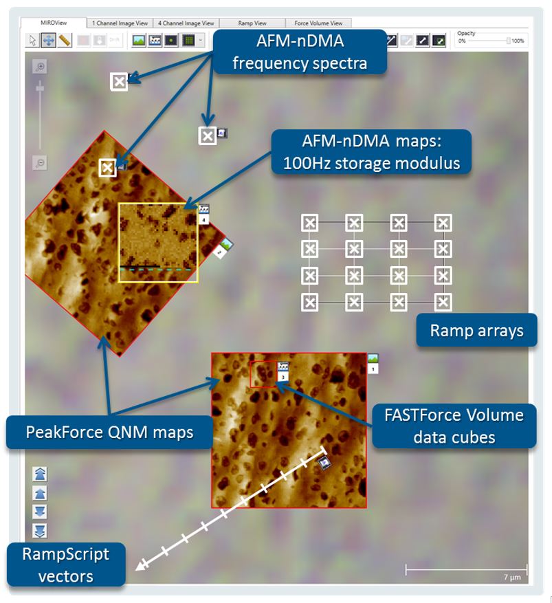 The addition of AFM-nDMA complements this information in two ways. First, by providing additional maps of storage modulus, loss modulus, loss tangent, along with 15 other nanomechanical data types, AFM-nDMA vastly expands the available the available property maps for identifying domains of interest. Second, AFM-nDMA allows for multi-frequency point measurements spanning the entire 0.1Hz to 20kHz frequency range, thereby providing comprehensive viscoelastic characterization of targeted nanoscale domains.