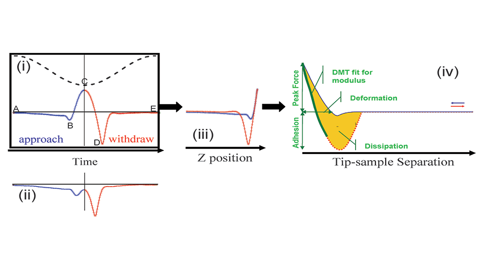 Once a force curve is obtained, it is must be converted to a force versus separation plot for fitting and further analysis. The tip-sample separation is different from the Z position of the modulation since the cantilever bends. Figure 1(iv) is a sample of a force-separation plot illustrating the types of information that can be obtained. The most commonly used quantities are elastic modulus, tip-sample adhesion, energy dissipation, and maximum deformation.