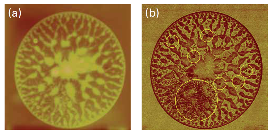 For example, figure 8 shows an antibacterial film consisting of poly(methyl methacrylate) (PMMA) and silver nanoparticles. From topography alone (a), it is difficult to tell the locations of the silver nanoparticles. The adhesion map (b), however, reveals distinct nanoparticles (indicated by smaller circles) as well as an area enriched in many particles (large circle). Contact mode imaging would likely push the particles out of the way, making it impossible to see them. TappingMode PhaseImaging might be able to see the difference in the particles if the probe and imaging parameters were chosen correctly, but PeakForce QNM can see differences in adhesion, modulus and dissipation independently, making it more likely that there will be a difference in one of the data channels.