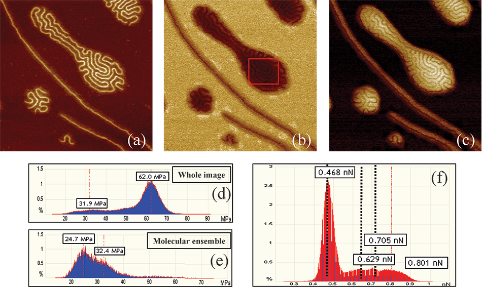 Figure 7 shows a set of images collected of PBA using PeakForce QNM. In the height image (a) the backbone is clearly visible both as a long isolated molecule and as a folded set of molecules (a molecular ensemble). In the modulus map (b) it is clear that the soft (dark) backbones are surrounded by areas that are slightly stiffer, presumably where the short side chains are present. Figure 7(d) is a histogram showing the relative frequency of various modulus values in the image. The peak at 62MPa is from the background (mica covered by low molecular weight amorphous polymer), while the broad peak at 31.9MPa is from the brush molecules and molecular ensembles. By examining the region given by the red square in (b) it is possible to see that there are two peaks in the modulus of the molecular ensemble, as shown in figure 7(e). The one at about 25MPa corresponds to the backbone of the chains, and the one at about 32MPa corresponds to the surrounding region filled with short brushes. These numbers are not expected to be quantitative since the molecules are small in comparison to the tip and the deformation of the sample. Even though the DMT model is not appropriate in this case, the qualitative interpretation that darker regions are softer than the brighter regions leads us to speculate that the polymer backbones are being partially supported by the short side chains.
