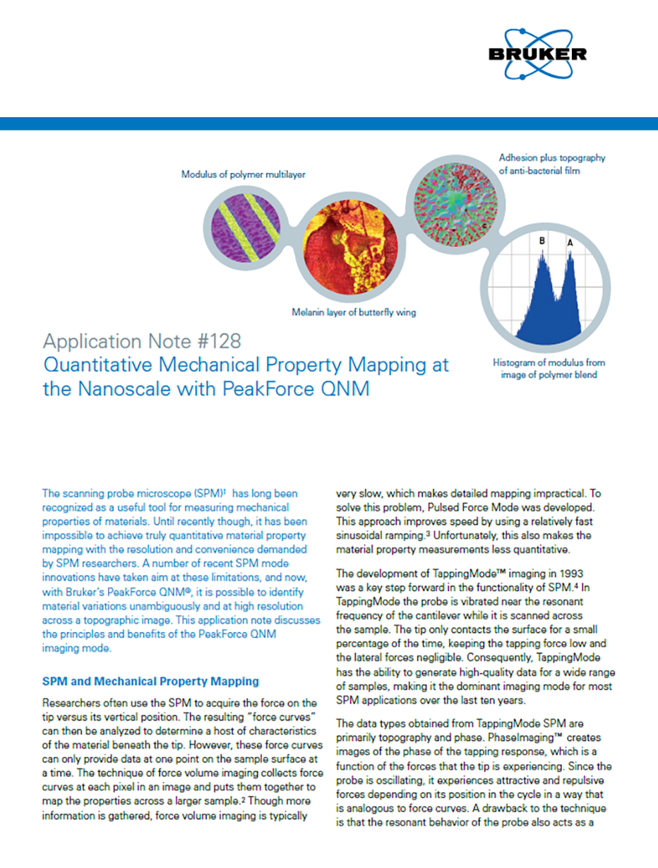 The scanning probe microscope (SPM)1 has long been recognized as a useful tool for measuring mechanical properties of materials. Until recently though, it has been impossible to achieve truly quantitative material property mapping with the resolution and convenience demanded by SPM researchers. A number of recent SPM mode innovations have taken aim at these limitations, and now, with Bruker’s PeakForce QNM®, it is possible to identify material variations unambiguously and at high resolution across a topographic image. This application note discusses the principles and benefits of the PeakForce QNM imaging mode.