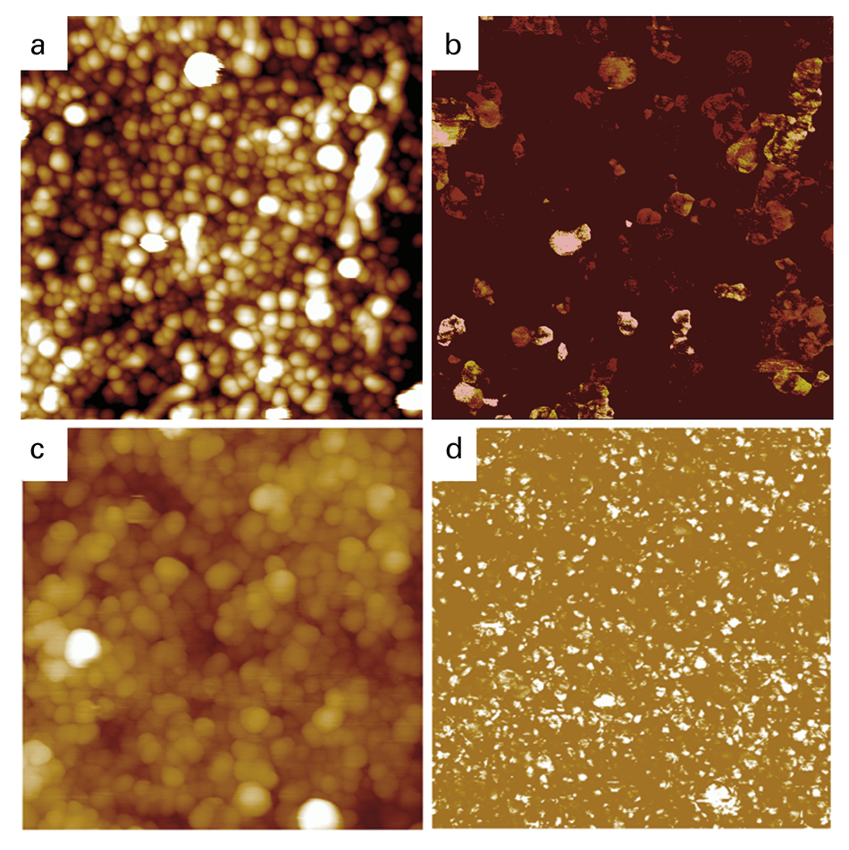 Figure 12a and b show PeakForce TUNA images of a vertical multi-walled carbon nanotube mat on a conductive substrate. Seen are the end caps of the nanotubes. Initially, it was expected that all of the multi-walled nanotubes would be conductive. However, as observed in the peak current map, this is not the case, but instead the different bundles exhibit different levels of conductivity(see figure 12b). Two possible interpretations are that there is variability in how the nanotubes are connected to the underlying substrate, or that the capping of the tubes is affecting the measured conductivity even if the cylindrical part of the tube is conductive and base attached. The same sample was tried with Contact Mode–based TUNA, however no stable images could be attained. TR-TUNA gave a current image that looked quite different (see figure 12c,d). Several discontinued conductive spots appeared on single tubes, and this is against intuition as we expect more uniformity on each individual tube. The lateral twisting motion of the probe in the Torsional Resonance Mode is likely to be causing an intermittent electrical contact to the surface.
