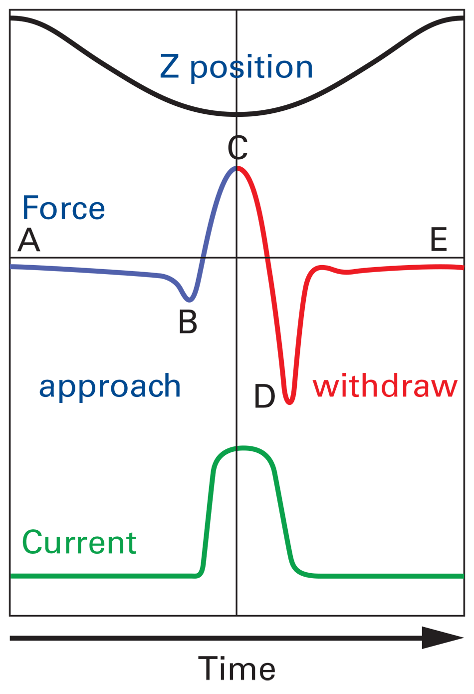 Figure 2 illustrates what happens when the periodically modulated PeakForce Tapping probe interacts with the surface. The top line represents the Z-position of the cantilever base, as a function of time, as it goes through one period. The middle line represents the force measured by the probe during the approach (blue) and withdraw (red) of the tip to the sample. The bottom line (green) represents the detected current passing through the sample. Since the modulation frequency is about 1kHz, the time from point A to point E is about 1ms.