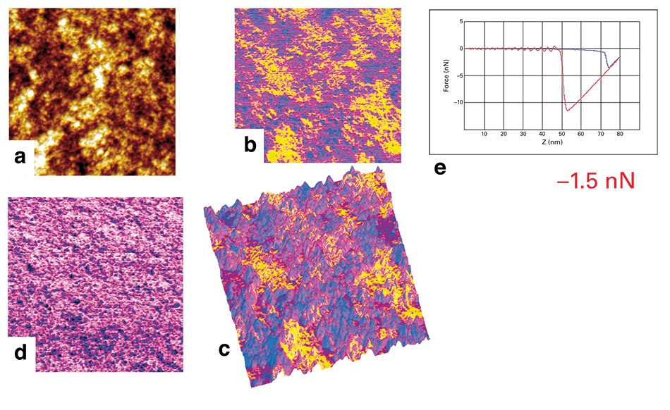 The foundation of material property mapping with PeakForce QNM is the ability of the system to acquire and analyze the individual force curves from each tip-sample interaction that occurs during the imaging process. The curves are analyzed in real-time to obtain quantitative mechanical properties of the sample, including adhesion, modulus, deformation, and dissipation. These material property maps are treated as conventional AFM channels, and can be displayed and analyzed together with topography.