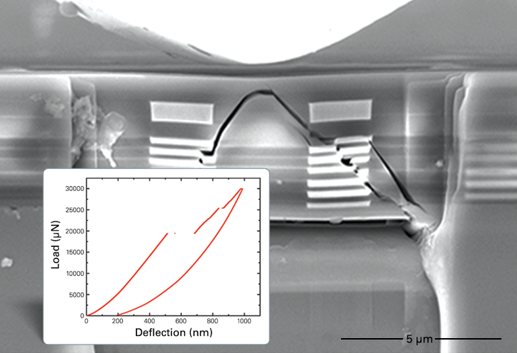 Os dados mecânicos in-situ adquiridos com o Hysitron PI 80 são sincronizados com a imagem SEM e exibidos no formato de vídeo lado a lado. Medições mecânicas simultâneas e dados SEM permitem uma compreensão mais completa do comportamento da deformação do material. No exemplo à esquerda, as descontinuidades nos dados de deslocamento de carga estão correlacionadas com o início da fratura observada em uma viga fresada com FIB contendo interconexões de cobre e material dielétrico frágil.