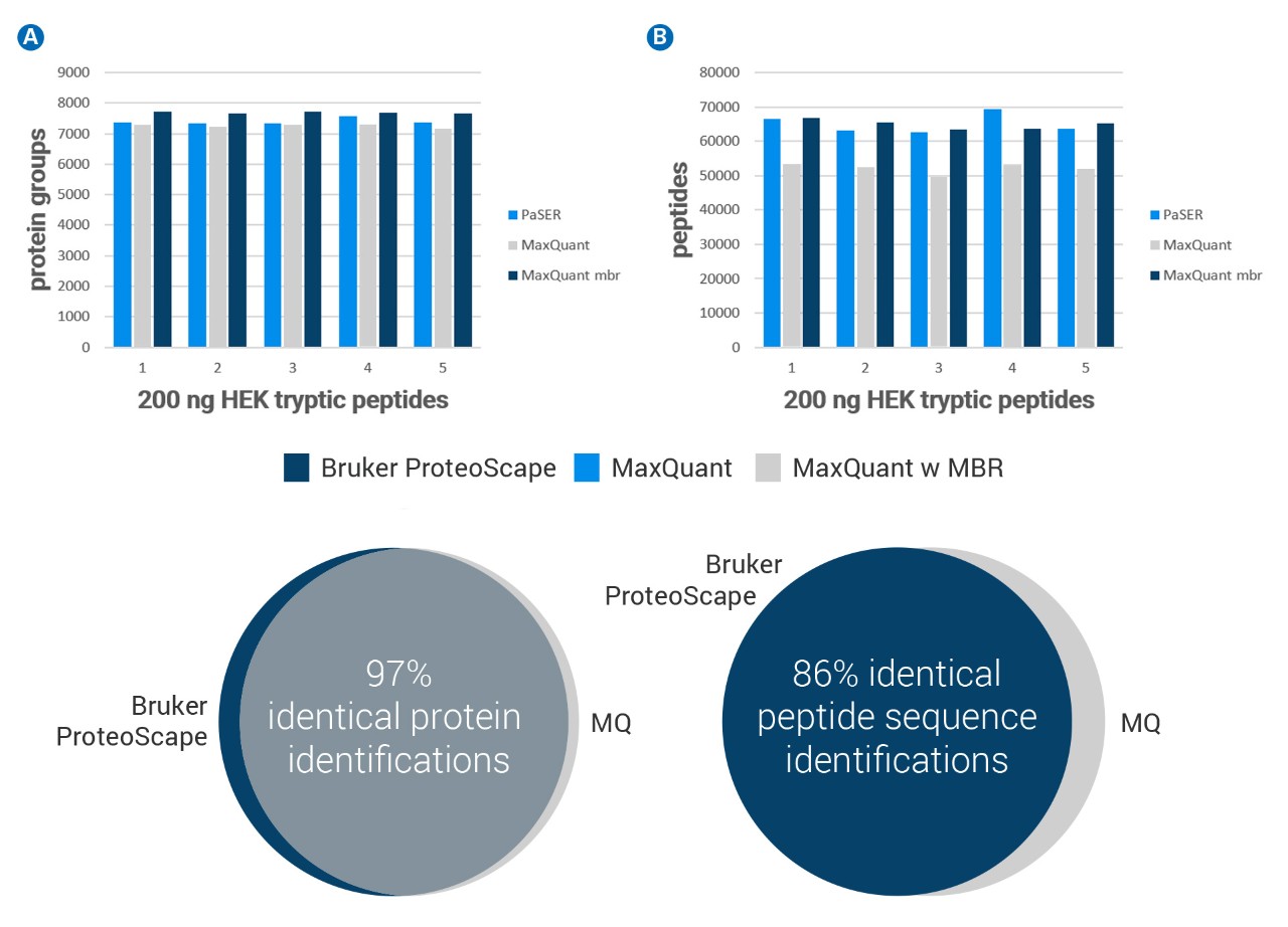 B) Peptide ID from replicate DDA runs of a human cell lysate using Bruker ProteoScape™ for real-time results and benchmarked against MaxQuant