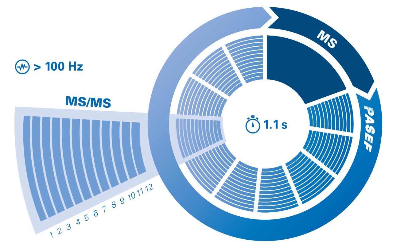 The parallel accumulation serial fragmentation (PASEF®) technology achieves a sequencing speed of >100 Hz. Using PASEF® increases the MS/MS spectra quality of the low abundant peptides by selecting them several times.