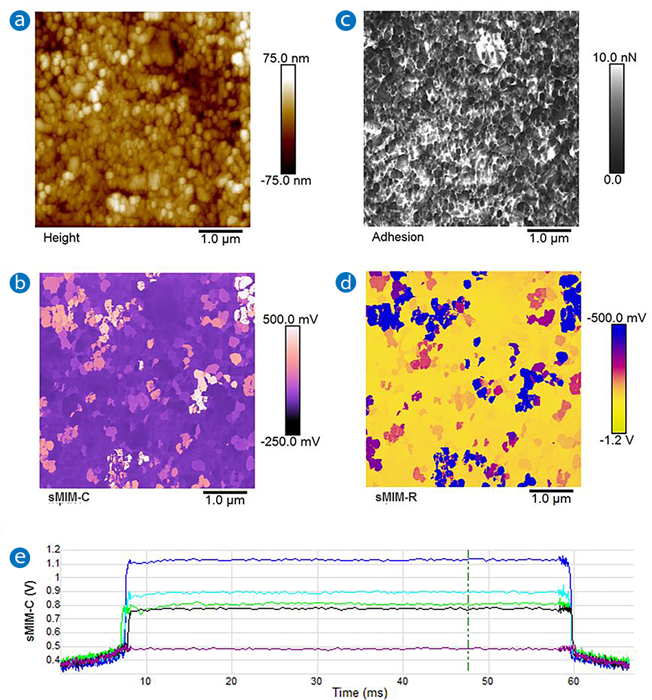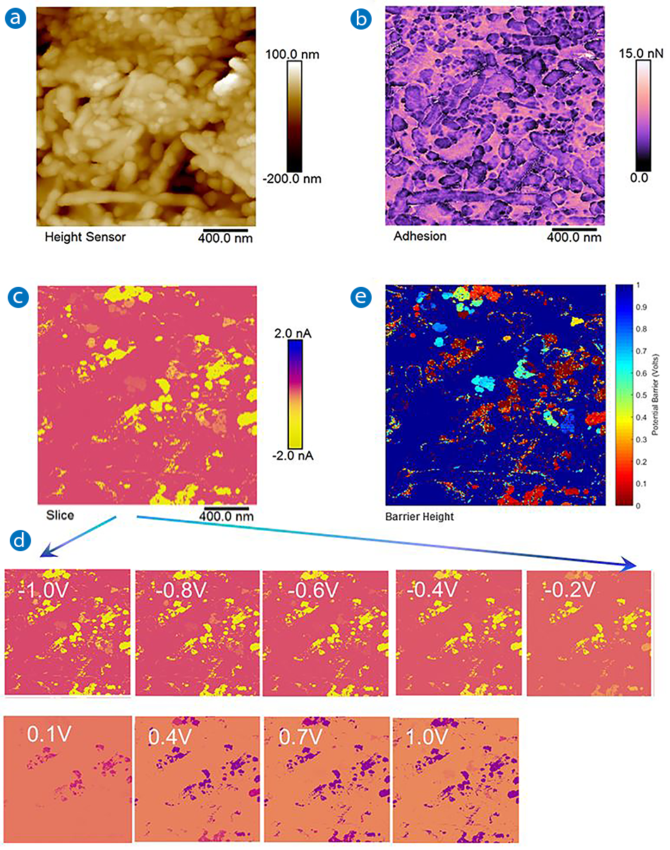 Figure 3. Processing, analysis, and visualization of DCUBE data. Slices of the spectroscopic maps can be extracted for regular processing of AFM images in NanoScope Analysis software: (a) surface topography; (b) quantitative nanomechanical properties— adhesion map; (c) a slice map from TUNA current—sample bias (I-V) spectra at -1 V (cover image of a movie created from 130 slices available on the Bruker website); (d) slices of TUNA current maps at selected voltages; and (e) scanning barrier height images created by analyzing all I-V spectra. The color bar displays from ohmic (zero) to insulating (one). NanoScope Analysis software goes with a MATLAB toolbox that allows one to extract the whole cube of data for further analysis in MATLAB. Image (e) was created by MATLAB.