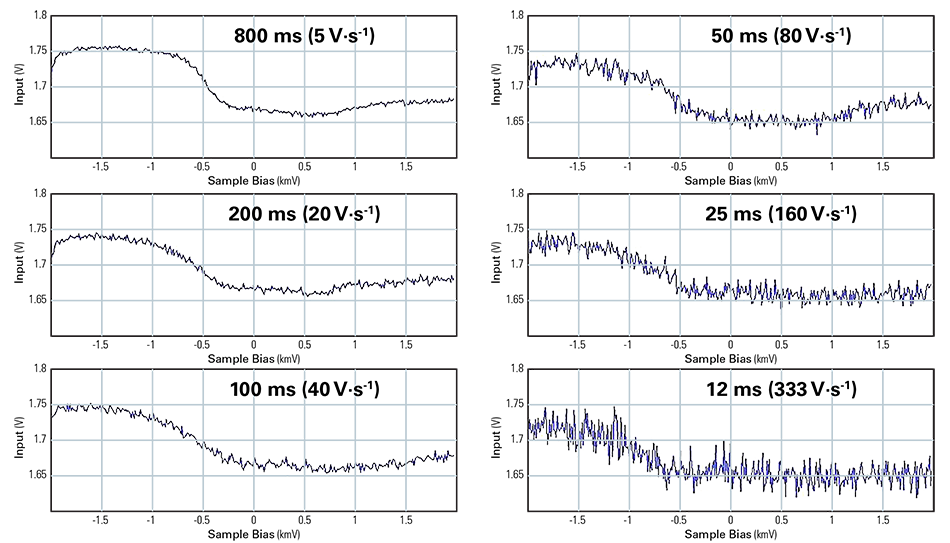 Figure 2. A series of C-V spectra of a p-type semiconductor captured by DCUBE-sMIM. These are raw data without averaging. The dwell time and the sample bias ramp rate for each spectrum are indicated.