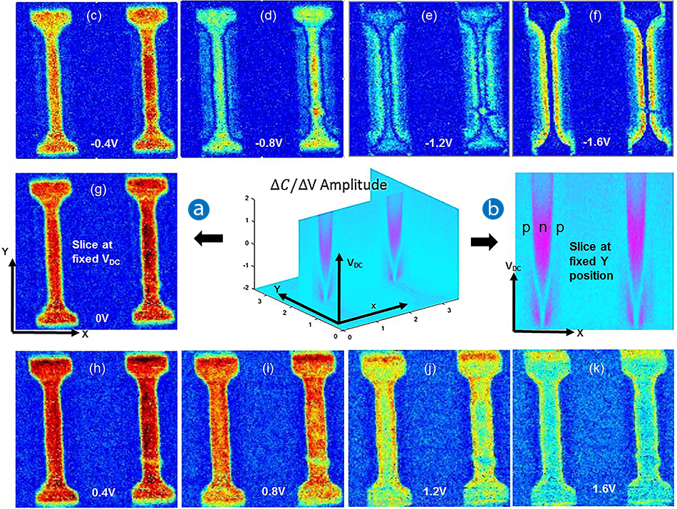 Figure 10 shows typical data extracted from a DCUBE-sMIM study. In this example, we used a Si sample with a n-type and p-type staircase carrier profile, which forms a candidate sample for quantification of AFM-based carrier profiling methods.32 Both the C-V spectra (sMIM-C vs sample bias) and R-V spectra (sMIM-R vs sample bias) were collected within 100 ms per pixel, covering a bias range of -2 V to +2 V. Having images over this bias range helps to differentiate and locate all carrier levels and regions in the sample. This is seen in the sMIM-C data in Figure 10a-c. The negative bias in Figure 10a drives the p-type regions into depletion regime, enhancing their contrast. The n-type regions are in the inversion regime, depressing their contrast, while the positive bias in Figure 10c has the opposite effect. Figure 10g combines this information in a single spatio-spectral slice.