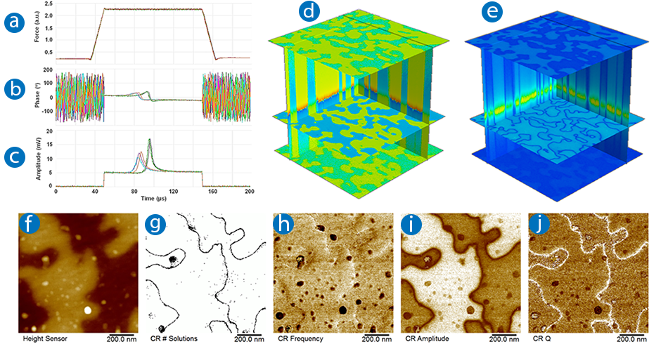 Figure 14a to 14c shows some typical DCUBE-CR PFM force ramping, PFM phase, and PFM amplitude spectra of a LiTaO3 (LTO) sample. In this measurement, the frequency was ramped from 250 to 400 kHz in every pixel during a 100 ms dwell period. Figure 15d and 15e shows the phase and amplitude data cubes, respectively.19 The size and the space pixel density of these two cubes are 3x3 μm2 x 150 kHz and 256x256x260. The horizontal planes show phase (Figure 14d) or amplitude (Figure 14e) maps at specific frequencies, where different piezoelectric domains are well differentiated at and near contact resonance. Vertical planes are phase (Figure 14d) or amplitude (Figure 14e) changing with the sweep frequency, which demonstrates shifts in the contact resonance frequency between different domains. Figure 14f-14j shows the DCUBE-CR PFM data on the same LiTaO3 sample with a smaller scan size of 1x1 μm2. Figure 14f is the surface topography with a roughness (Rq) of ~1.5 nm. Figure 14g shows the number of peak that the algorithm found during the fitting. At the domain boundaries and in some contaminant positions, this signal becomes zero indicating that the material does not show piezoelectric response. The “CR Frequency,” “CR Amplitude,” and “CR Q” channels in (h)-(i) are maps of contact resonance frequency, amplitude, and quality factor found upon fitting the hold sweep spectra. This example demonstrates that DCUBE-PFM in conjunction with contact resonance provides the full benefits of DCUBE-PFM with the added benefits of providing a frequency ramp at every pixel, providing a full spectrum and the peak sensitivity at the contact resonance.