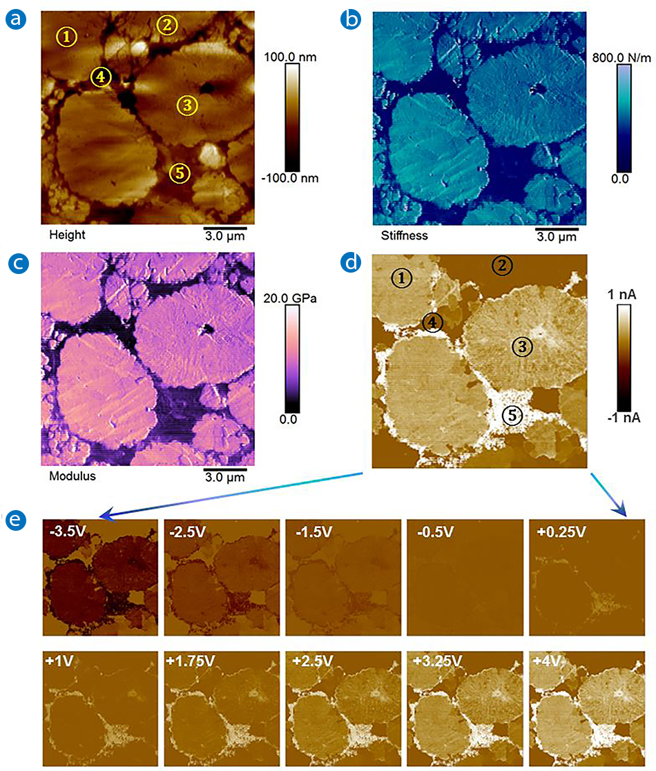 Figure 6. DCUBE-TUNA study of a battery cathode consisting of Li metal oxide (1)-(3), polymer binder (4), and conductive carbon nanoparticles (5): (a) surface topography; (b) quantitative surface stiffness differentiating different domains; (c) quantitative modulus map; and (d)-(e) TUNA current slices from the spectroscopic mapping at selected sample voltages. The scanning area is 15x15 µm2.