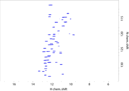 Figure 6: Proton detected INEPT-based 13C HSQC correlation from a fully protonated solid biological sample (SH3 domain of chicken alpha-spectrin).