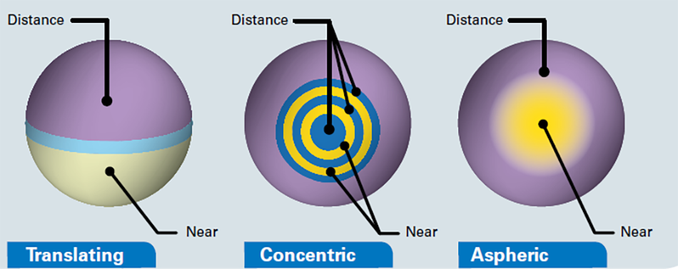 Bifocal lenses can be designed in several different ways. Figure 1 shows the three main designs. The translating or alternating design is very similar to bifocal glasses, with distance on the top and near power on the bottom. The eye needs to alternate between the top and bottom of the contact lens to see properly. The other two designs are simultaneous designs, which require your eye to look through both the distance and near powers at the same time. Although this might sound difficult, the brain functions as a highly capable image processor to help select the correct power depending on how close the viewer is to the object of interest. Aspheric designs have near focus in the center and distance focus on the outer perimeter. However, the predominant methodology today is the concentric design, where a lens structure with alternating optical concentric lens is structured for either distance or near vision and again the eye looks through both distance and near powers at the same time.