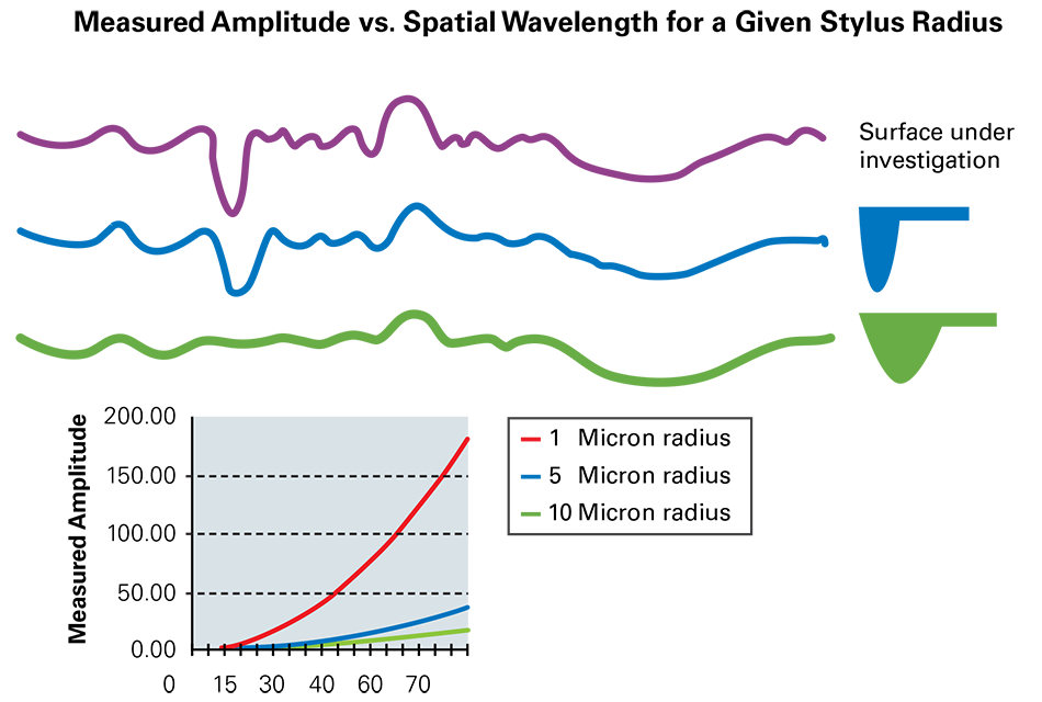 For aspheric and stepped surfaces, the current metrology solution is a 2D stylus device. In ophthalmic applications the stylus is generally scanned in one X and one Y profile to capture the asymmetric nature of the lens, and measure the individual step heights of structures on the lenses. Stylus measurements are contact-based and are slow compared to non-contact optical methods. The operator also has to position the stylus device manually. If the operator does not correctly position the stylus to intersect the apex of the lens, inaccurate measurements will be obtained. Contact stylus can also damage the soft lens if not frozen before measurement. For structured surfaces it is insufficient to measure one X and one Y position so the entire lens may need to be mapped. However, the 2D stylus is too slow for this task and risks damaging the surface being measured. The diameter of the tip also limits the features that can be measured. For example, if the stylus tip is 5 microns in diameter it cannot measure features smaller than 5 microns.