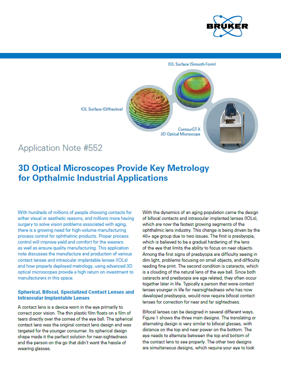 With hundreds of millions of people choosing contacts for either visual or aesthetic reasons, and millions more having surgery to solve vision problems associated with aging, there is a growing need for high-volume manufacturing process control for ophthalmic products. Proper process control will improve yield and comfort for the wearers as well as ensure quality manufacturing. This application note discusses the manufacture and production of various contact lenses and intraocular implantable lenses (IOLs) and how properly deployed metrology, using advanced 3D optical microscopes provide a high return on investment to manufacturers in this space.