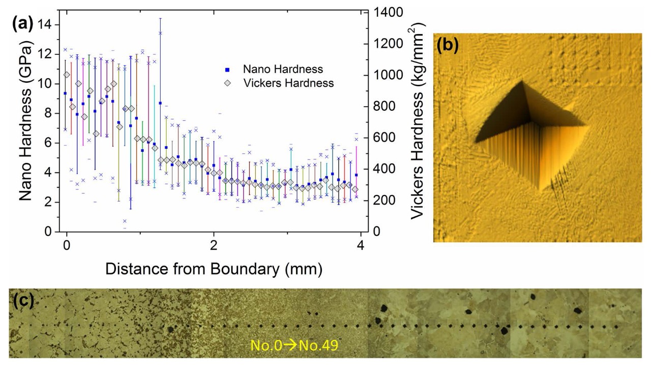 The total number of indents is now n = 225 for each sample, which is a factor of a 20 times larger number of tests than for most nanoindention studies. The pileup corrected modulus and hardness histograms (Fig. 7) show both an increase in hardness for the roughened/work-hardened sample and a corresponding increase in the spread of the data. Combining both statistical analysis and mapping compared against high-speed nanoindentation for a railway weld joint in a railway steel can be compared to traditional Vickers microhardness testing.49–51 Here, 196 indent grids produced by high-speed nanoindentation with 5-mN load and a Berkovich indenter are compared against a single Vickers indent in a line scan starting in the weld joint and moving progressively through the heat-affected zone, using an empirical relationship to compare hardness.52 The grid of nanoindentations fit into approximately the same area as the single microhardness test (Fig. 8). In this case, a variety of microstructures are encountered, from martensitic rich regions near the weld joint progressively into bainite and finally ferrite. It can be observed that although the hardness versus distance curves are comparable between the average value of the high-speed nanoindentation grids and microindentation, the grids feature scatter bands due to the varying microstructure. For instance, the spread is increased near the weld joint, as the martensite clustered into islands around the grain boundaries, where as bainite and ferrite represent better dispersed microstructures. In these regions, a researcher could consider moving to more of a mapping rather than statistical sampling type of experiment.