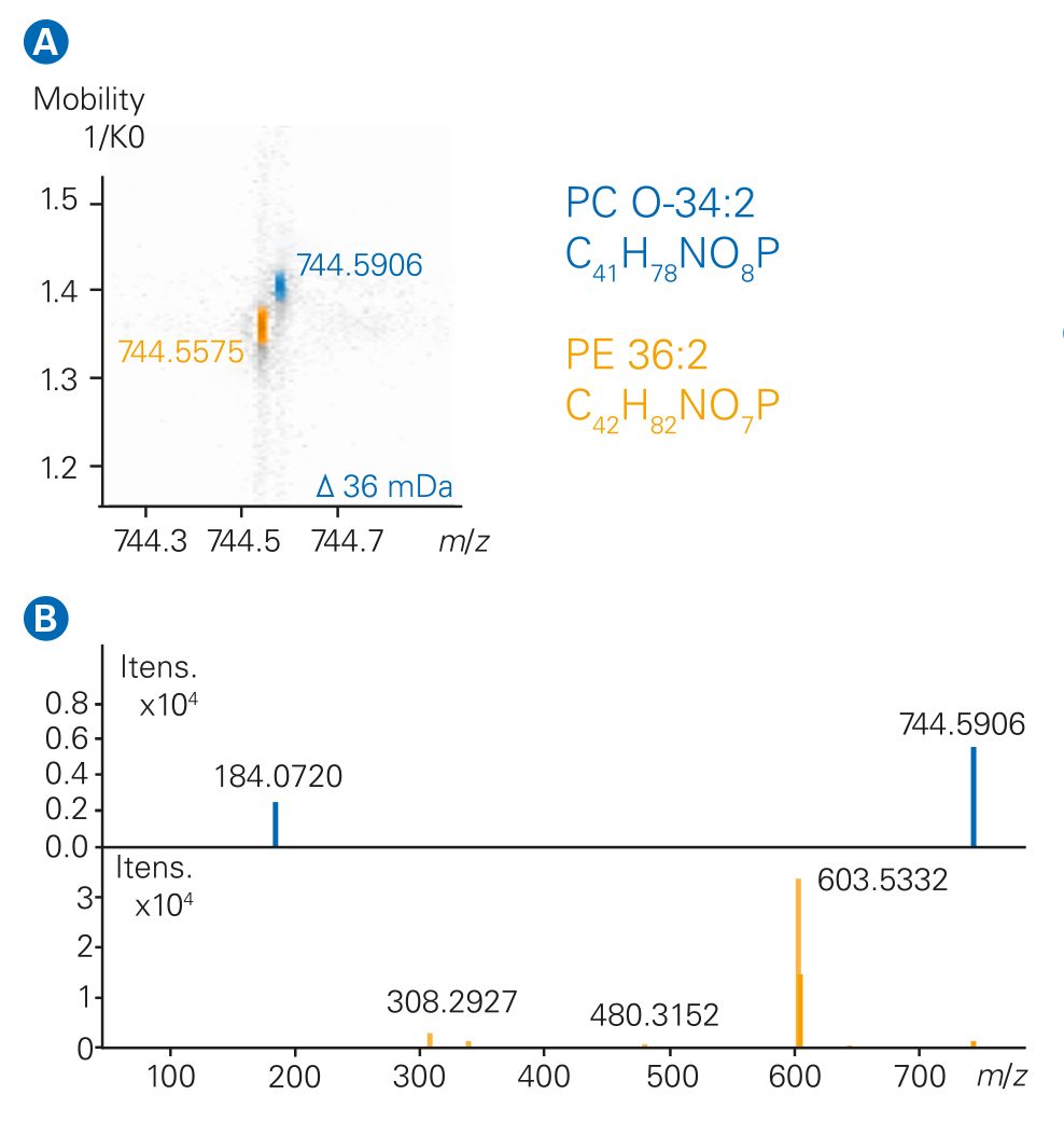 色谱峰型的改善、分辨率以及保留时间的重现性简化了数据分析流程,为高置信度的自动化脂质注释奠定了基础。TIMS 增强了对结构上有明显区别的同重素和同分异构体分离的能力,有利于选择性测量,并提供额外了分离维度以提高峰容量。