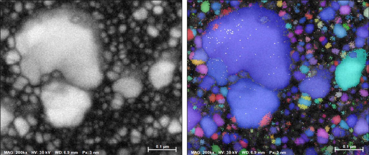 这种独特的硬件(HW)和软件(SW)选项组合的最终结果或优势,从图2(*)所示的TKD(透射菊池衍射)结果中清晰可见。花样质量图(左侧)定性地表明,当激活浸没式透镜时,显著提高(特征更加锐利)。在激活浸没式透镜时获取的取向图中,可以清晰地看到小于10纳米的晶粒/特征。