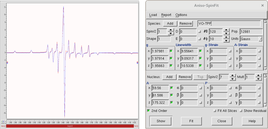 各向异性 SpinFit 模块可模拟粉末、冷冻溶液及玻璃态等无序系统的波谱。该模块运用二阶扰动理论优化自旋哈密顿量参数、谱线形状、谱线宽度及振幅。内置常用过渡金属模拟参数库及硝基氧化物刚性极限波谱库。