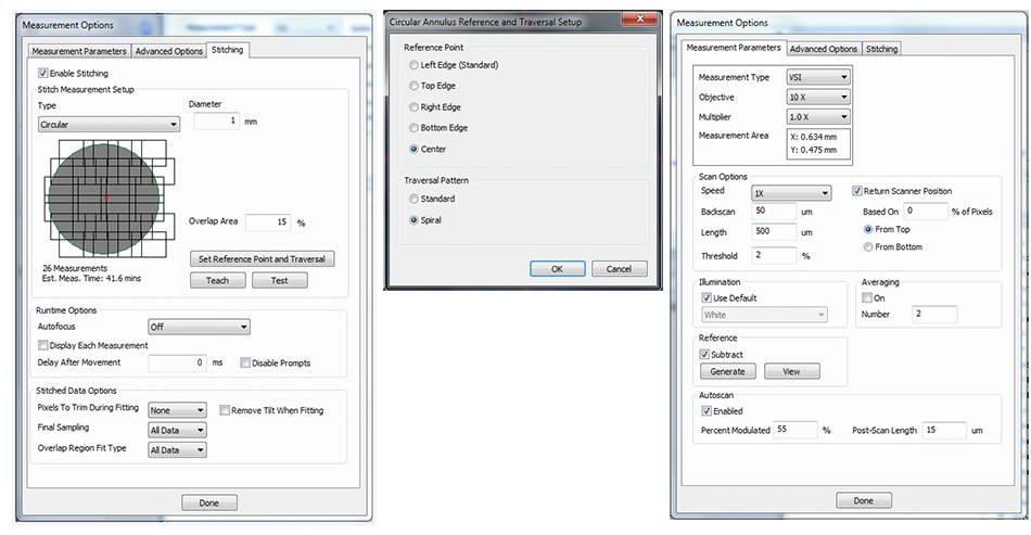Bruker has added automation capabilities to their 3D Microscopes to speed the ability to measure large surfaces that don’t fit into the field of view of one image. One enhancement is the ability to stitch multiple images together. This allows the ability to make approximately 1000 images and stitch them together into one complete image. Along with the stitching option, spiral stitching is an option where you can start at the apex of a lens and traverse down and around the lens until you reach the bottom. To ease setup, there is a lens stitch option where you enter the lens radius and sign.