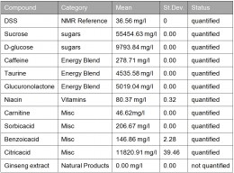 从16盎司听装Monster Energy饮料中取400µl试样,与200µl的D2O(氘氧化物)磷酸盐缓冲液混合,放置在盛有1µl混合液(300mM D2O中的DSS)的NMR管内。从Bruker Biofluid Reference Compound(Bruker生物流体参考化合物数据库)或内部波谱数据库中获取已知饮料成分的NMR波谱。